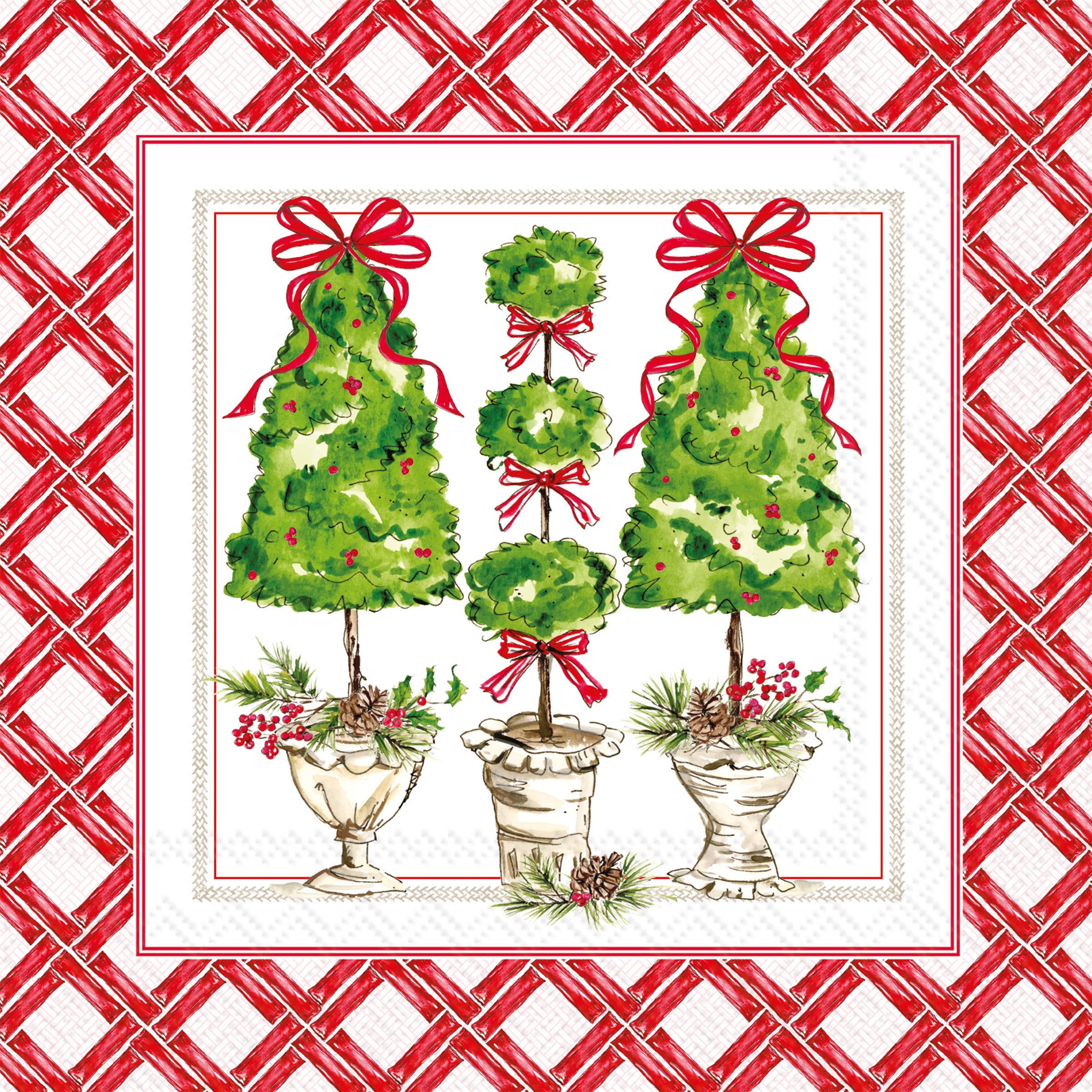 Watercolor topiaries trimmed with holly and finished in bold red ribbons give this lunch napkin a polished, garden-luxe look that instantly dresses up the table. Printed on soft, absorbent paper, it delivers everyday ease and party-ready style for casual meals, picnics, and special gatherings. Approximate dimensions are 6.5 x 6.5 x 1 inches. German printed on soft, 3-ply paper.