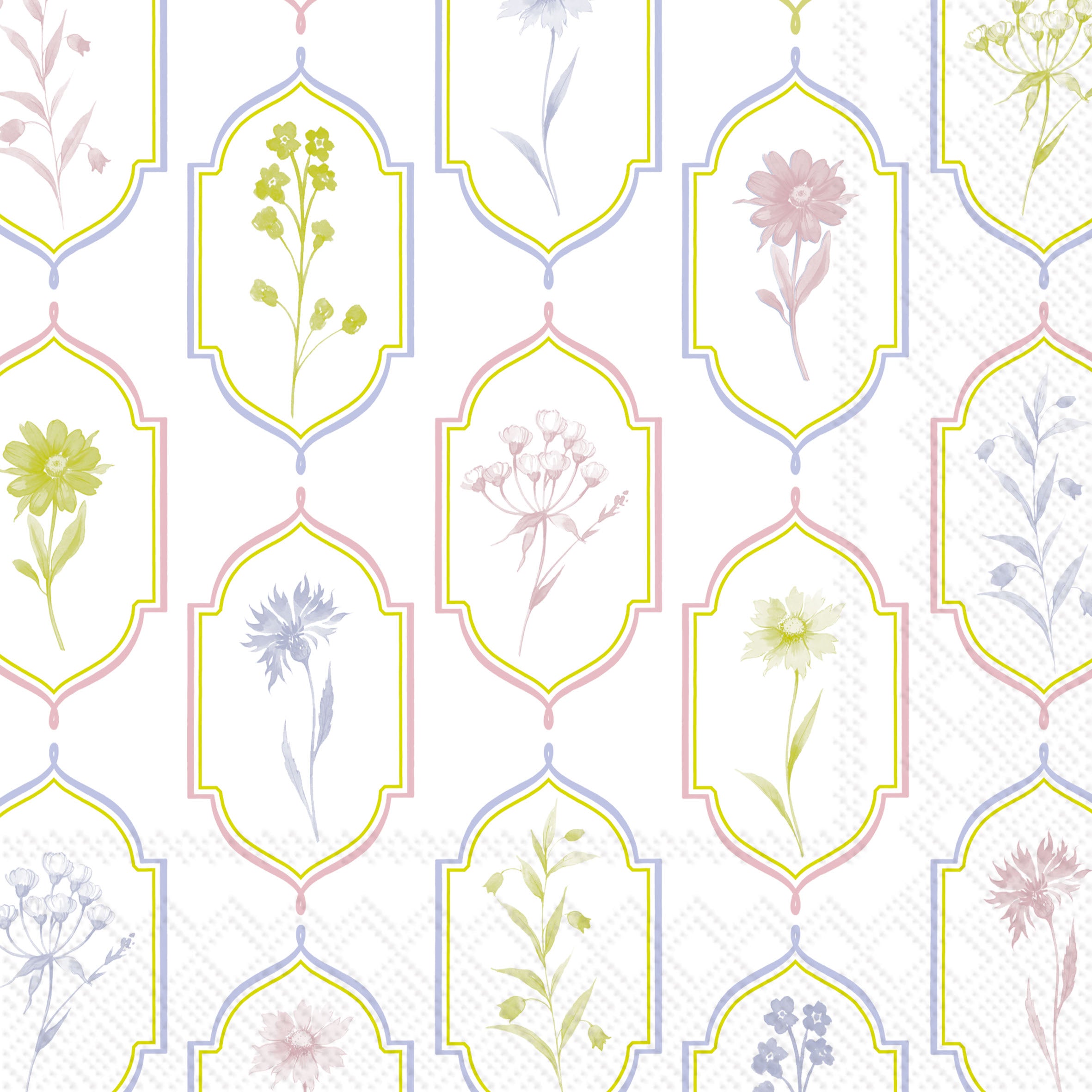 Philipa Light Green Lunch Napkin blooms with watercolor botanicals framed in pastel medallions and light-green accents, bringing a fresh, polished note to everyday meals and casual entertaining. Printed on quality paper, these floral lunch napkins mix effortlessly with solids and patterns to elevate place settings with easy elegance. Approximate dimensions are 6.5 x 6.5 x 1 inches. German printed on soft, 3-ply paper.