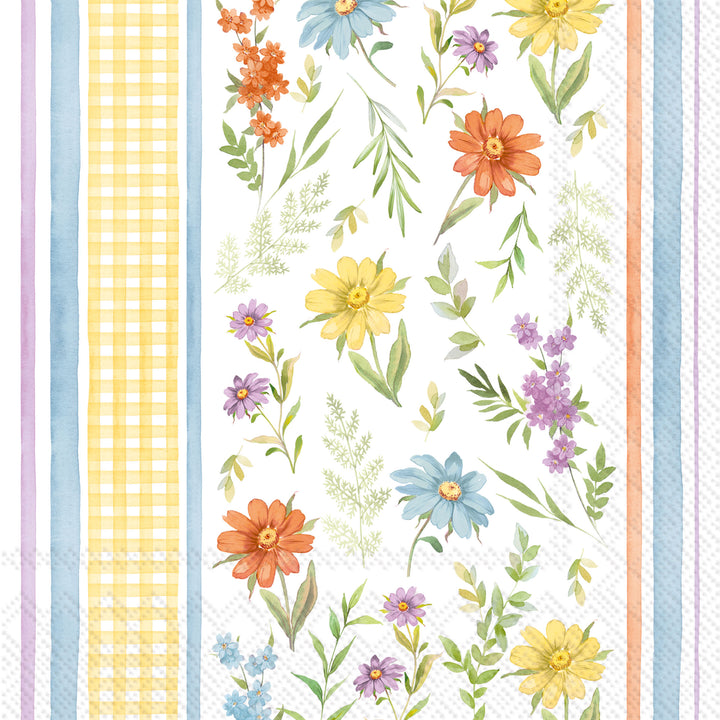 Watercolor blooms mingle with soft stripes and a cheerful gingham border for a look that feels light, layered, and effortlessly pretty. Printed on quality paper, this lunch napkin brightens everyday meals and casual gatherings with a fresh pop of floral pattern. Approximate dimensions are 6.5 x 6.5 x 1 inches. German printed on soft, 3-ply paper.