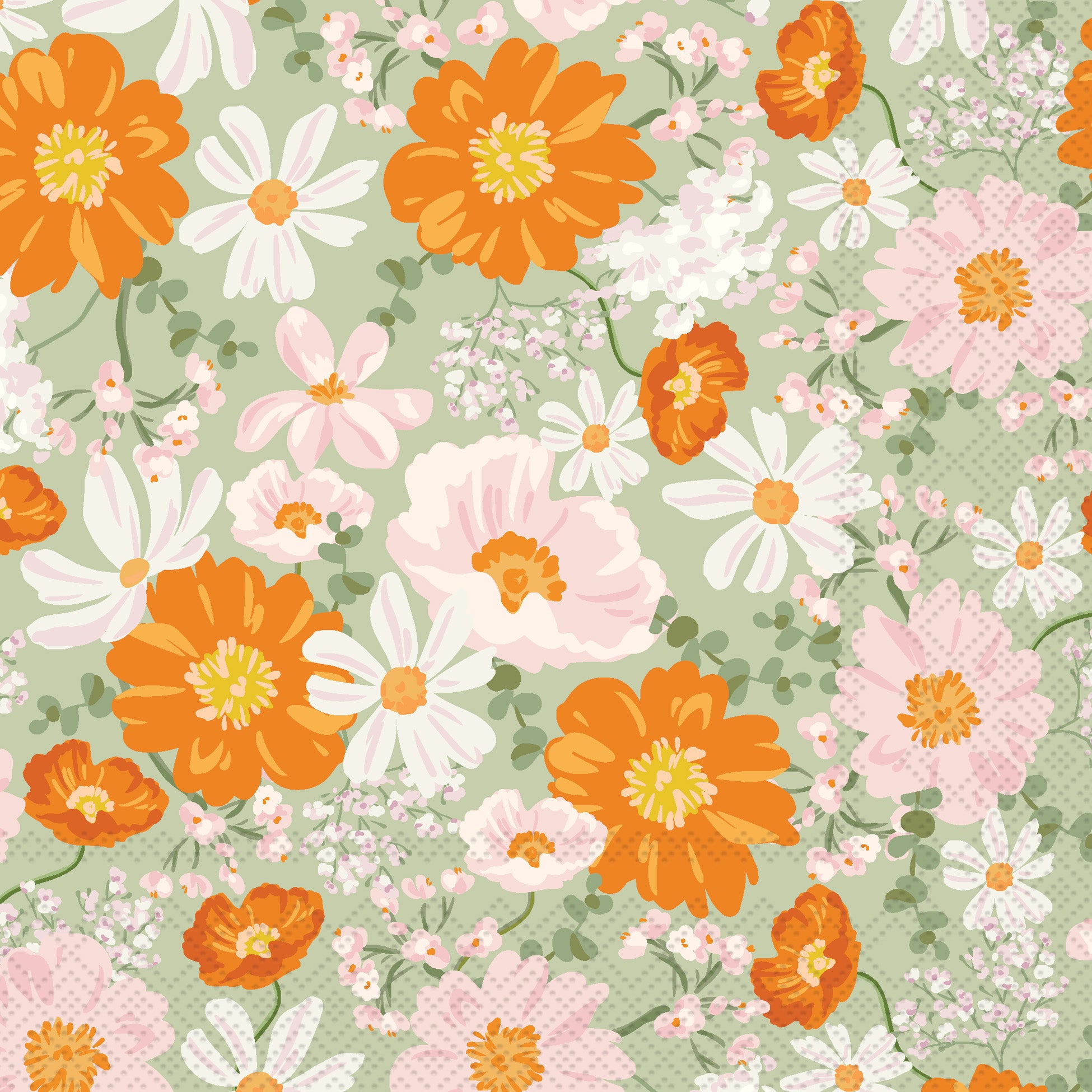 Bring effortless charm to the table with Bouquet Beauty Lunch Napkins, featuring a sage backdrop alive with painterly florals in blush, white, and vibrant orange. Crafted of soft yet sturdy paper, these floral lunch napkins elevate everyday meals and mix easily with your favorite solid serveware for a polished finish. German printed on soft, 3-ply paper. Approximate dimensions are 6.5 x 6.5 x 1 inches.