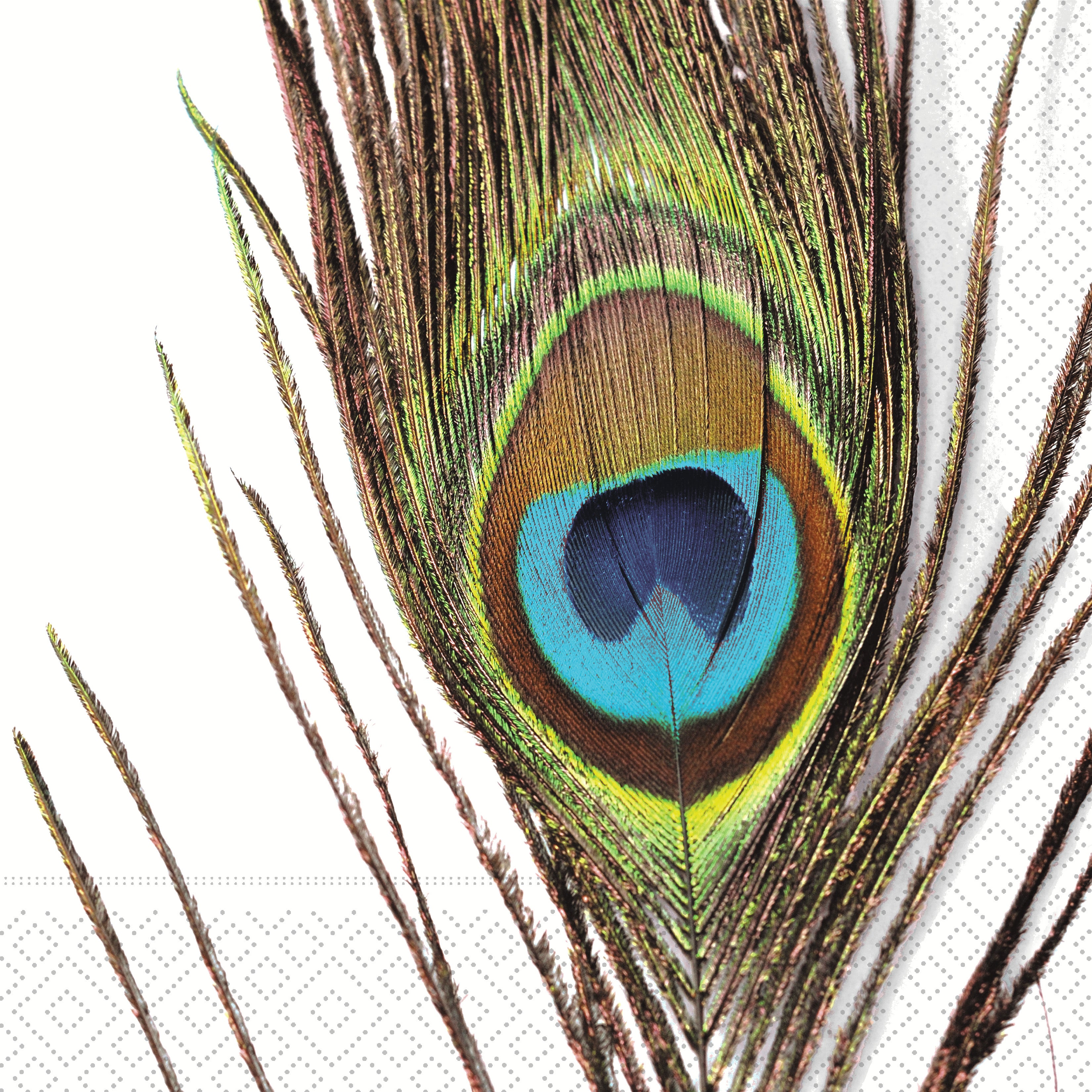 A vivid, iridescent peacock feather takes center stage on these soft, absorbent paper lunch napkins, adding instant elegance to everyday meals and casual celebrations. Sturdy yet refined, Eye Of The Peacock brightens place settings with jewel-toned color and featherlight flair, making cleanup beautifully simple. Approximate dimensions are 6.5 x 6.5 x 1 inches. German printed on soft, 3-ply paper.