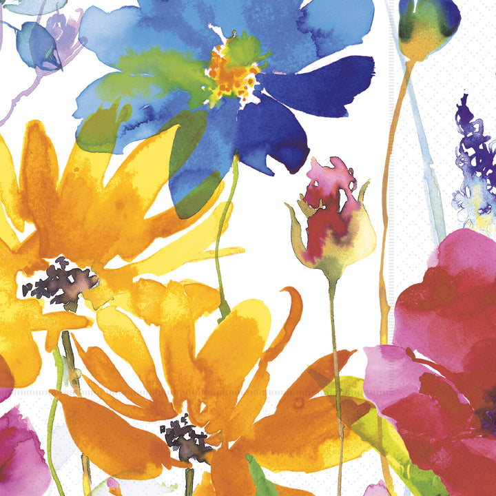 A burst of painterly blooms in bold primary hues brings artful energy to the table, with cobalt blues, sunny golds, and vivid magentas dancing across crisp white paper. Soft yet absorbent, these paper lunch napkins elevate everyday meals and casual gatherings while confidently handling little spills. Approximate dimensions are 6.5 x 6.5 x 1 inches. German printed on soft, 3-ply paper.
