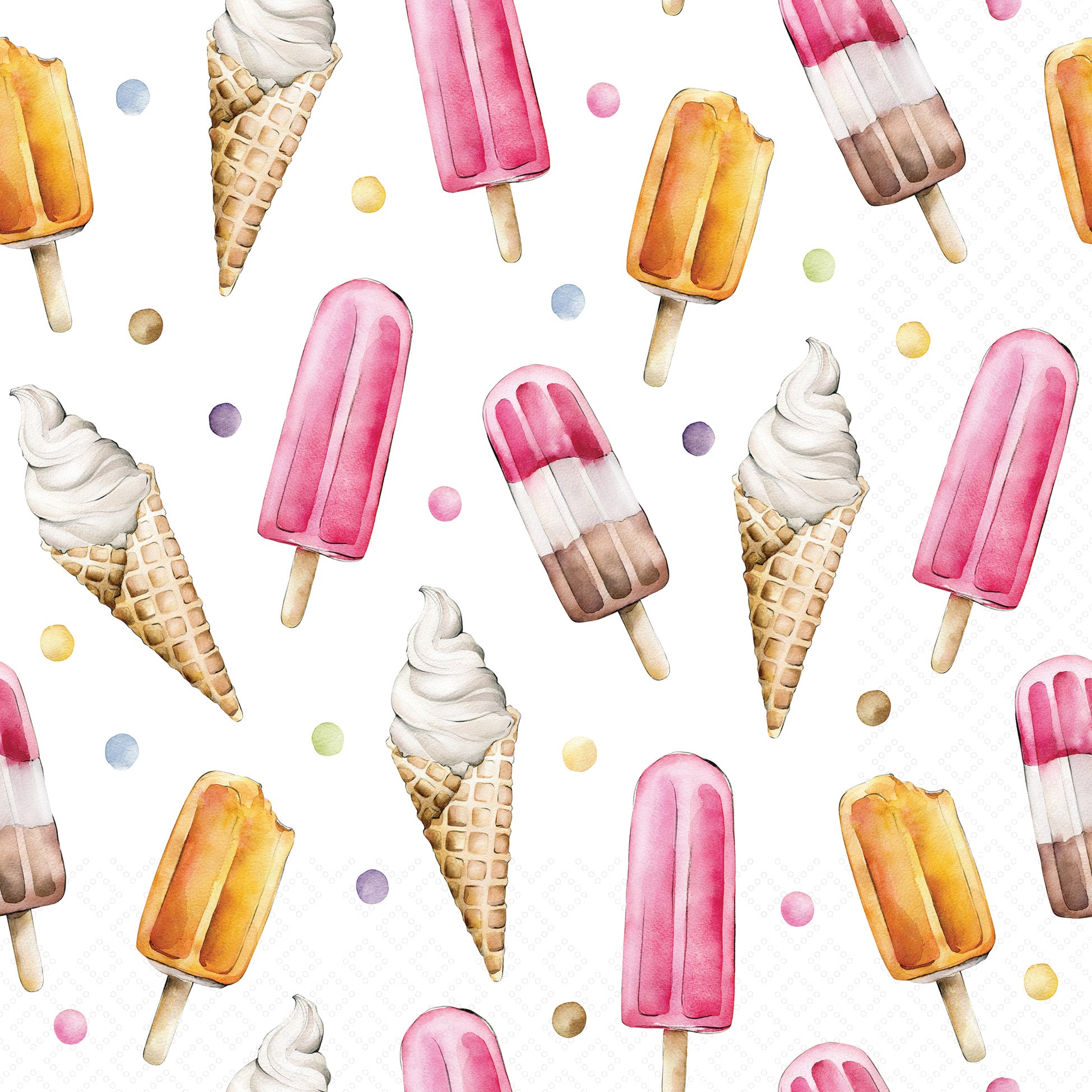 Serve smiles with the Frozen Treats Lunch Napkin, featuring a playful parade of watercolor ice cream cones, popsicles, and candy-like dots on soft white paper. These durable paper lunch napkins brighten everyday meals and snack breaks while keeping hands and surfaces tidy. German printed on soft, 3-ply paper.
