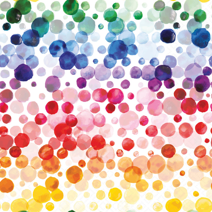 Bring a burst of color to the table with the Rainbow Dots Lunch Napkin, showcasing a lively cascade of watercolor-style circles in every hue. Made of disposable paper, this patterned lunch napkin adds playful polish to everyday meals and effortless entertaining. Approximate dimensions are 6.5 x 6.5 x 1 inches. German printed on soft, 3-ply paper.