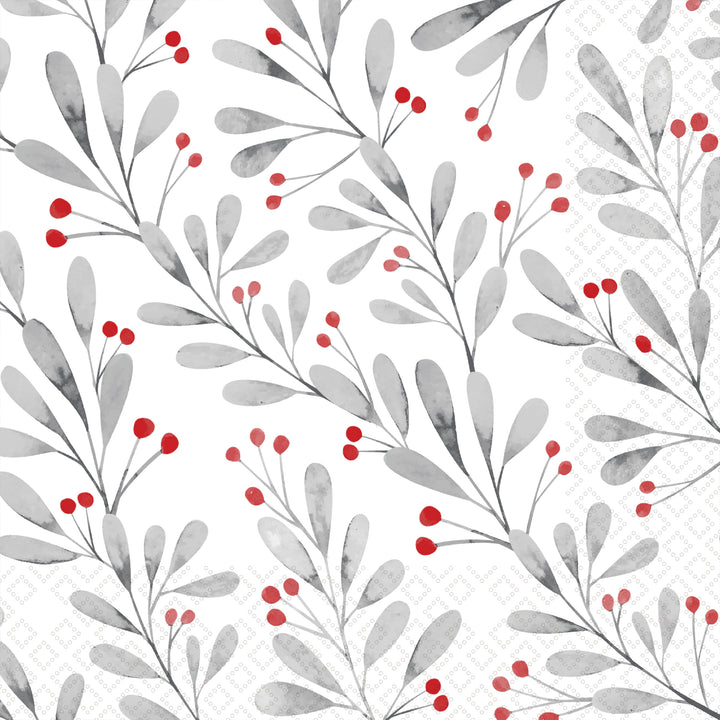 Watercolor-gray leaves dotted with lively red berries lend modern botanical charm to these soft paper lunch napkins. Absorbent and durable, L500055 layers beautifully with your table settings for everyday meals, casual gatherings, or cocktail hour. Approximate dimensions are 6.5 x 6.5 x 1 inches. German printed on soft, 3-ply paper.