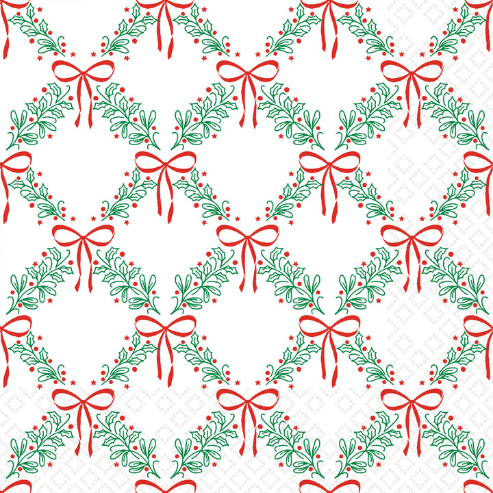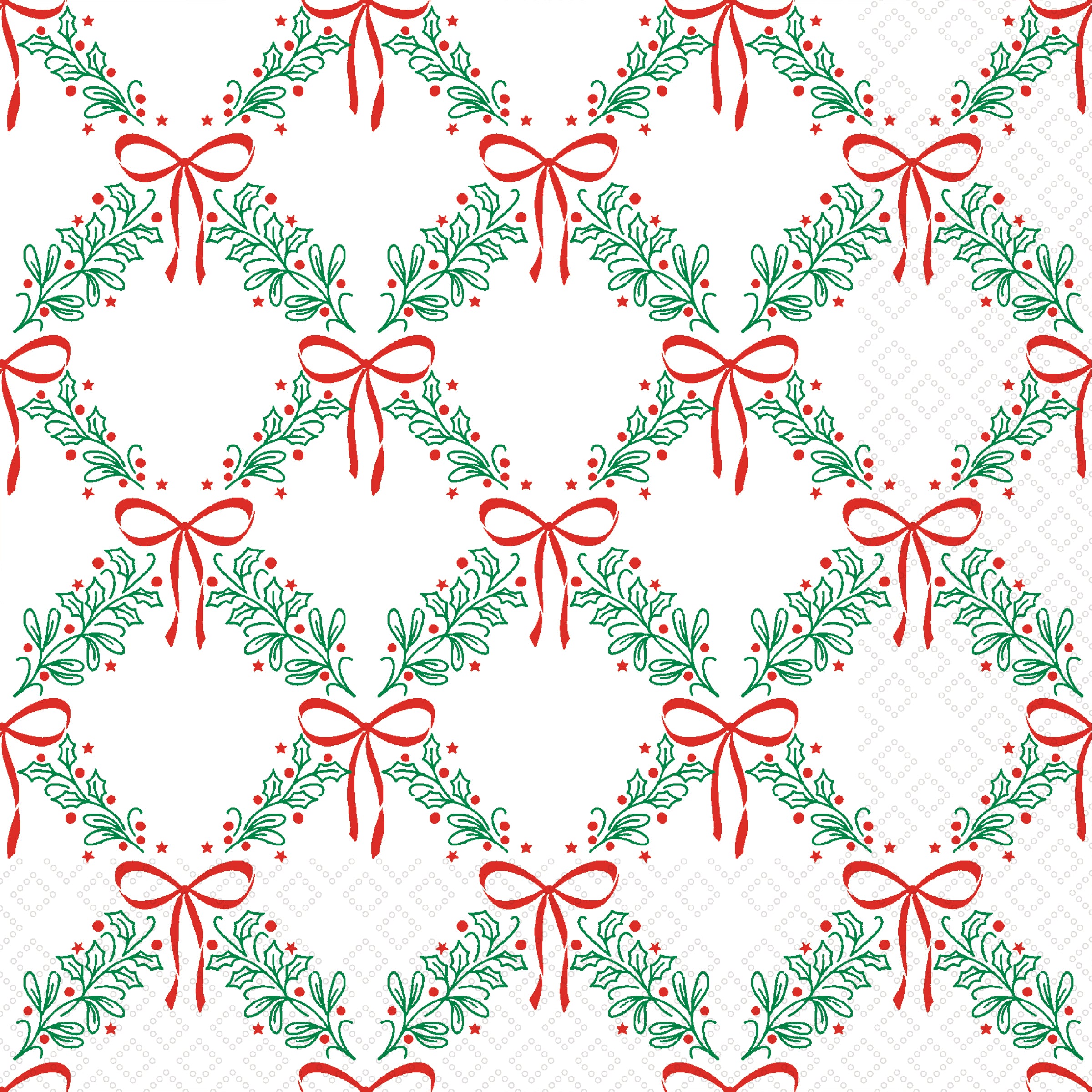 Bright red ribbons and garlanded holly dance across the Madeleine Lunch Napkin, giving every place setting a crisp, festive accent on soft, absorbent paper. Sturdy yet refined for daily meals or holiday gatherings, these lunch napkins add an effortless pop of color to buffets, picnics, and cozy tablescapes. Approximate dimensions are 6.5 x 6.5 x 1 inches. German printed on soft, 3-ply paper.