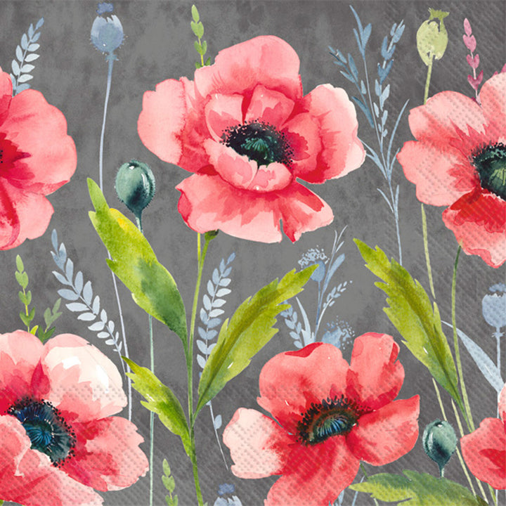 Mohana Lunch Napkin Grey features painterly poppies and delicate foliage on a charcoal-grey backdrop, instantly uplifting everyday tables with cultivated color. Crafted in paper for effortless cleanup, these lunch-size napkins blend floral romance with modern neutrals for a fresh, coordinated look. Approximate dimensions are 6.5 x 1 x 6.5 inches. German printed on soft, 3-ply paper.