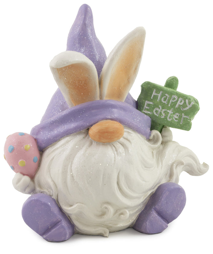 The Payson Purple Easter Gnome brings playful holiday cheer to shelves and tabletops, sculpted in resin with a tall lavender hat, bunny ears, and a pastel egg. Finished with charming textures and a cheerful sign, this durable figurine adds whimsical color to mantels, centerpieces, and tiered trays. Approximate dimensions are 6 x 3.5 x 6 inches.