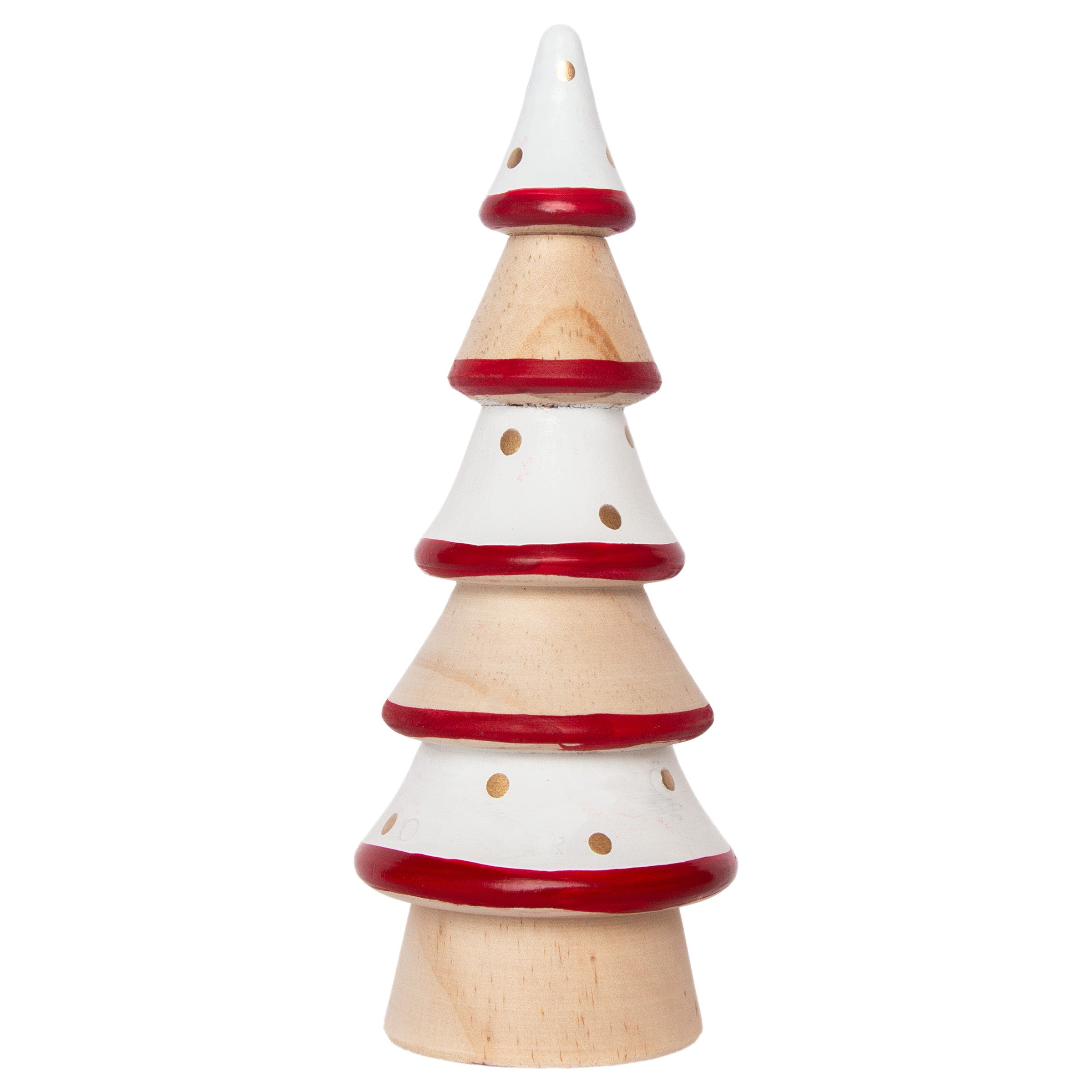 Carved from smooth pine wood, this sculptural accent stacks tapered tiers in natural grain with crisp white panels, bold red bands, and petite gold dots for a playful, modern look. Perfect for mantels, shelves, or tabletops, the Red And White Pinewood Tree brings inviting warmth, height, and a touch of whimsy to any curated vignette. Approximate dimensions are 2.25 x 2.25 x 5.75 inches.