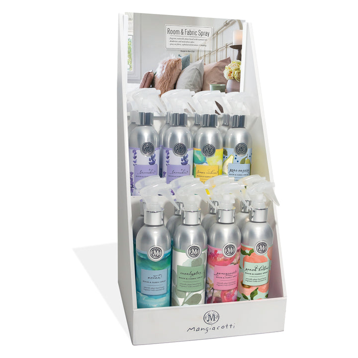 This starter program includes a wood display case, marketing inserts, and 4 each of the following fragrances: Eucalyptus (MAN3204), Lavender (MAN2442), Lemon Verbena (MAN2440), Ocean (MAN2444), Peach Bellini (MAN3185), Pear & Cassis (MAN3195), and Pomegranate (MAN2445).
