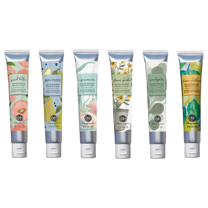 This tester kit includes tester stickers and one tube of each of the following fragrances: Aquamarine (MAN3254), Eucalyptus (MAN3203), Flower Garden (MAN3244), Lemon Verbena (MAN2510), Peach Bellini (MAN3184), and Pear & Cassis (MAN3194).