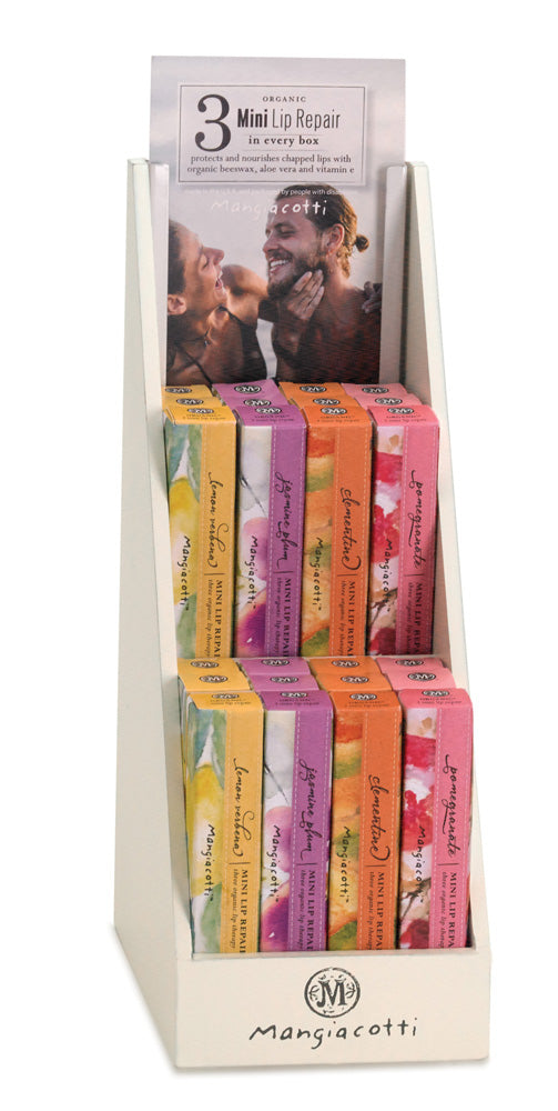 This starter program includes a wood display case, marketing inserts, 24 single samples (MAN2586), and one case (12 pcs, 36 mini tubes) of each of the following fragrances: Clementine (MAN2581), Jasmine Plum (MAN2605), Lemon Verbena (MAN2580), and Pomegranate (MAN2582).