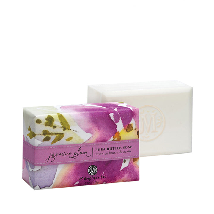 Experience Jasmine Plum, a modern abstract floral fragrance with a delicate balance of jasmine, violets, juicy plum, subtle sandalwood and patchouli. Enriched with vitamin E, essential oils & shea butter, this triple-milled body bar creates a creamy lather for a luxurious experience. Shea butter deeply moisturizes to nourish and improve elasticity, leaving your skin feeling soft and smooth. This beautifully embossed bar is hand-wrapped. Approximate dimensions are 3.3 x 2.1 x 2.1 inches.
