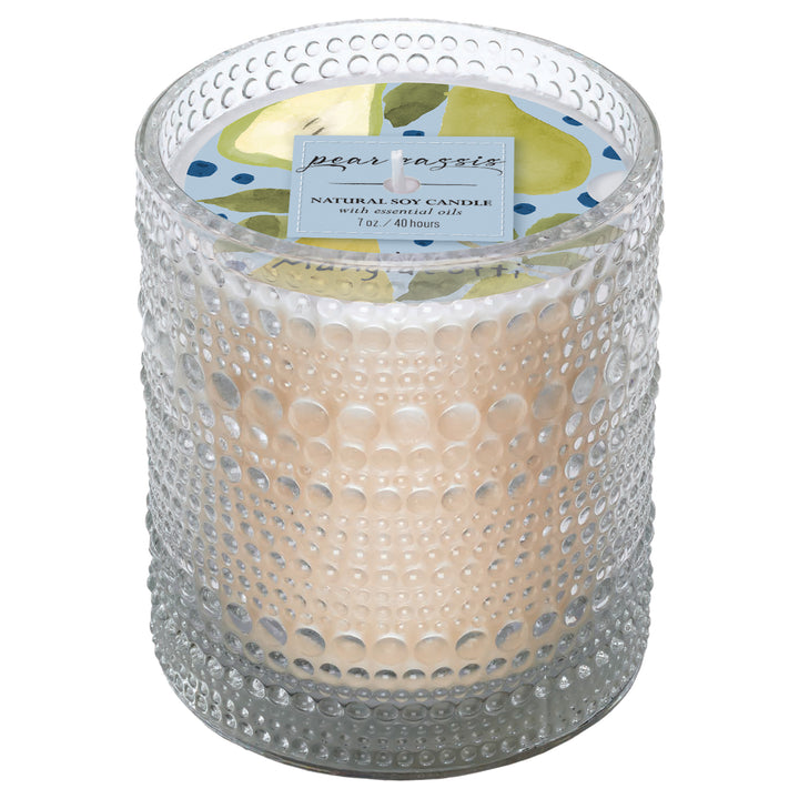 A refreshing lively light fragrance that is blended with juicy anjou pear, blackcurrant buds, tonka bean, caramel and linden blossom. This earth and mood friendly hand-poured candle sits in a recycled, reusable glass container. Enjoy 40 hours of aromatherapeutic attitude adjustment made right here in the USA. Approximate dimensions are 2.75 x 2.75 x 3.1 inches.