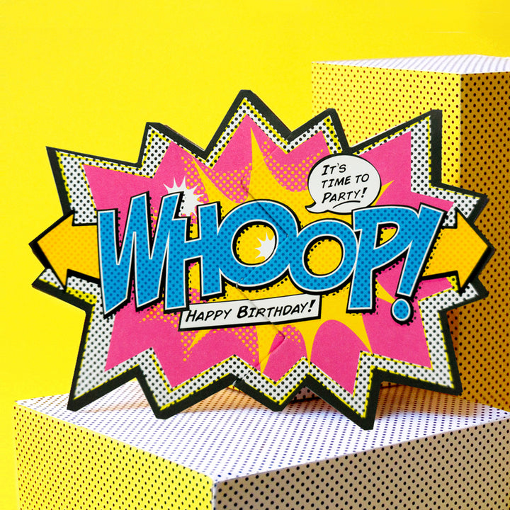 Kick off the celebration with a die-cut pop-art explosion that shouts “WHOOP!” and features a playful “It’s time to party!” speech bubble and “Happy Birthday!” banner. Printed on quality paper, this humor-packed greeting delivers bold color and comic-book flair for a birthday message that can’t be ignored. Approximate dimensions are 7.25 x 5.25 x 0 inches.