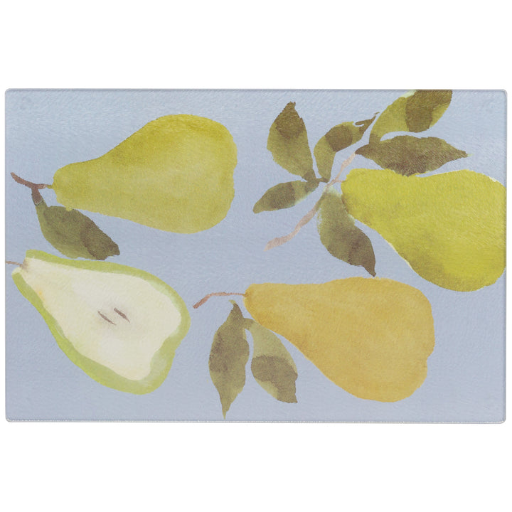 Bring a fresh, artful touch to tastings with this small charcuterie board, where watercolor pears pop against smooth tempered glass. The nonporous, durable surface beautifully presents cheeses and nibbles and wipes clean in a snap, making it an everyday favorite for compact serving. Approximate dimensions are 16 x 12 x .25 inches.