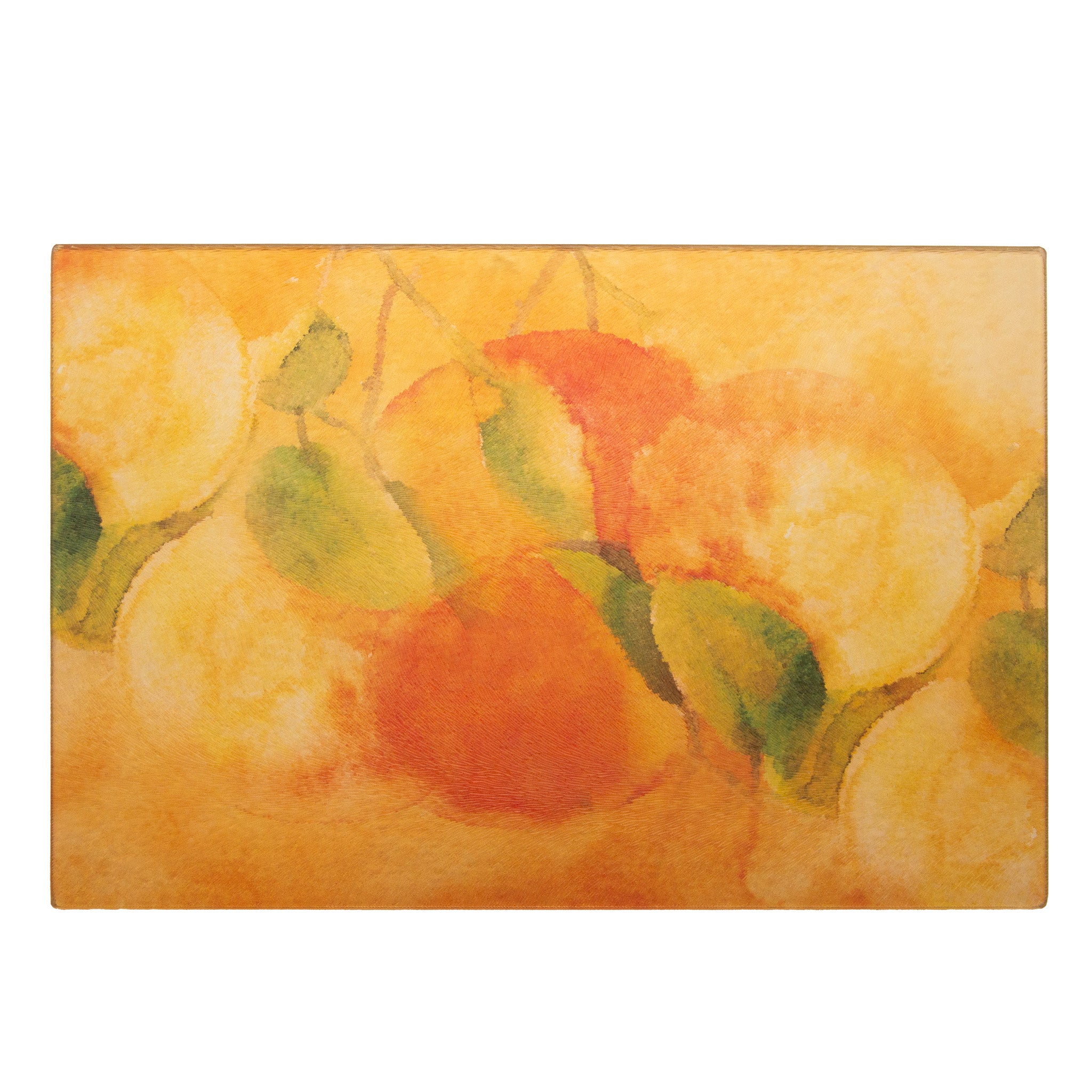 Painterly clementines bathe this compact charcuterie board in luminous color, transforming casual nibbles into a gallery-worthy spread. Made of durable tempered glass, its non-porous surface showcases cheeses, meats, and fruit with clarity and cleans up effortlessly. Approximate dimensions are 16 x 12 x .25 inches.
