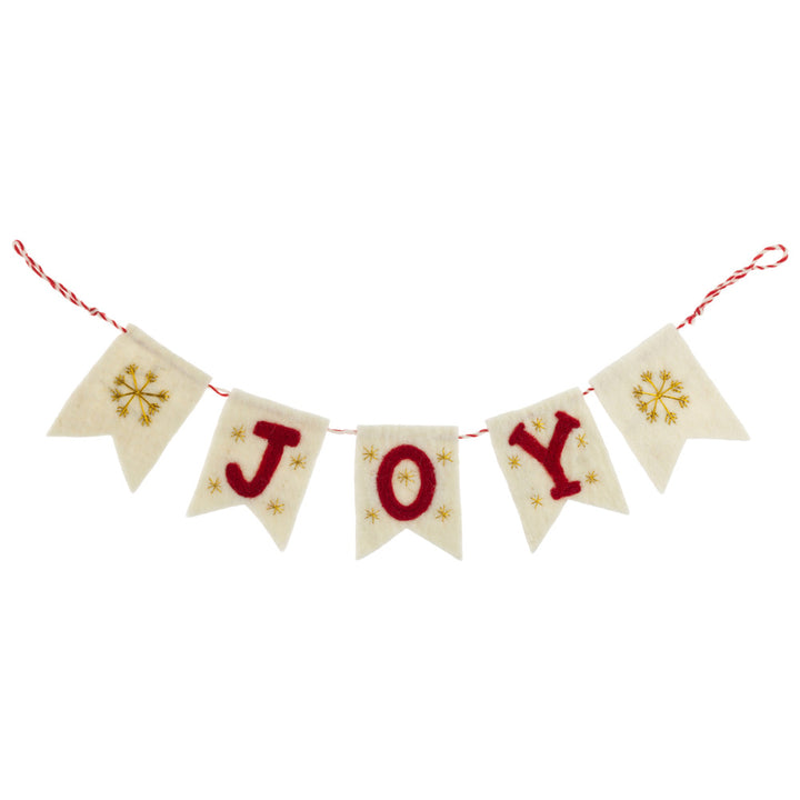 Crafted from soft wool, this garland features cream felt pennants with rich red “JOY” lettering and gold-stitched starbursts, strung on a red-and-white twisted cord for easy hanging. A simple, cheerful accent, it warms mantels, shelves, and party backdrops with a welcoming sentiment. Approximate dimensions are 23 x x inches.