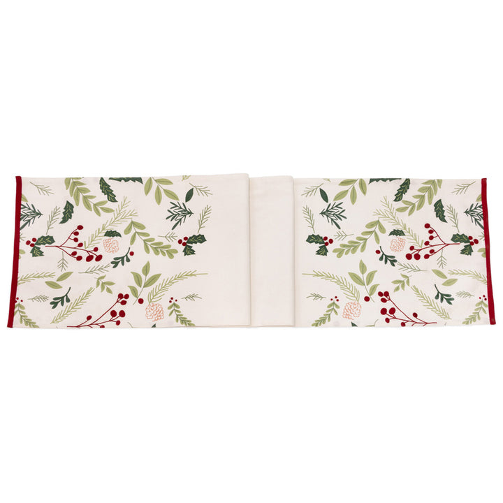 Dress your table in botanical charm with the Holly and Berries Table Runner, where leafy holly, bright berries, and graceful sprigs scatter across a warm ivory ground finished with clean red edging. Crafted from sturdy duck cotton, it offers a crisp, weighty drape and everyday durability that frames centerpieces and stands up to lively meals. Approximate dimensions are 72 x 14 x inches.