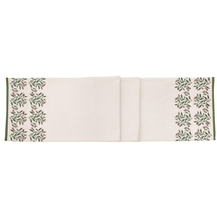 Crafted from substantial duck cotton, the Holly Table Runner frames your table with crisp borders of leafy sprigs and berry-red accents for fresh botanical character. Its smooth, weighty weave drapes beautifully and stands up to daily use, lending refined evergreen charm to casual breakfasts and dressed-up dinners alike. Approximate dimensions are 72 x 14 x inches.