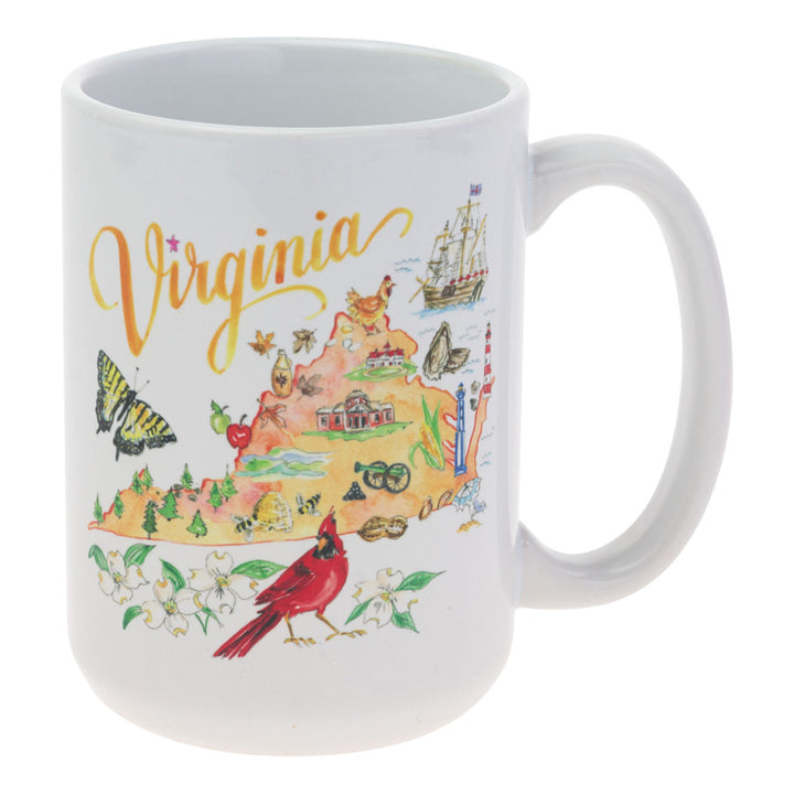 Celebrate the Commonwealth with every sip in this dolomite Virginia State Collection Mug, illustrated with a lively map and iconic motifs like the cardinal, dogwood blossoms, peanuts, and coastal scenes. Durable and comfortably weighted, this spirited piece of drinkware brings colorful state pride to your tabletop and makes a charming accent for daily coffee or tea. Approximate dimensions are 5 x 3.25 x 4.75 inches.