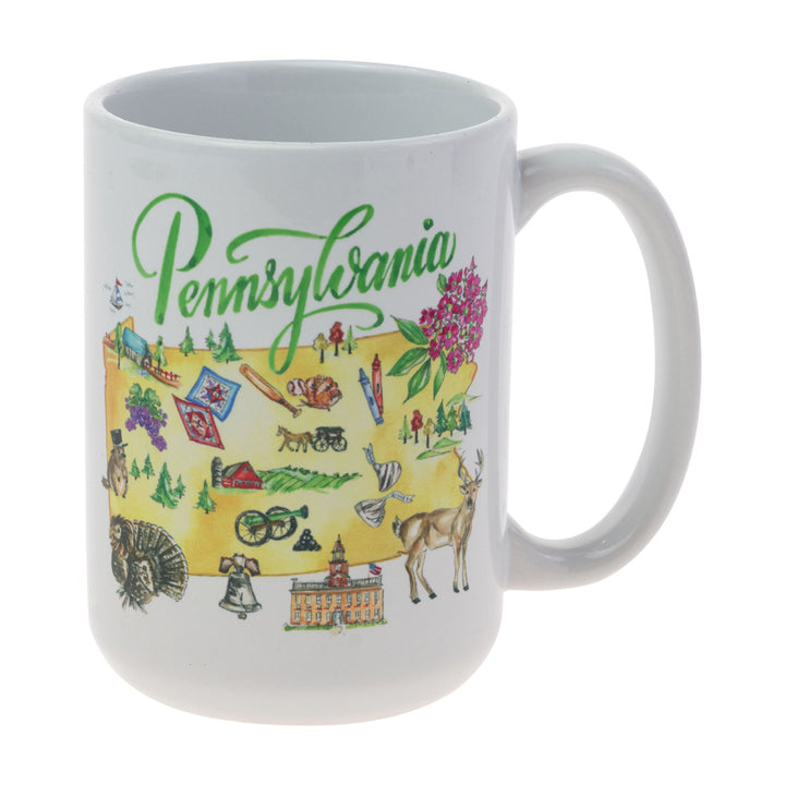 Celebrate Keystone State pride with this Pennsylvania State Mug, wrapped in colorful illustrations of beloved landmarks and regional icons. Made of durable ceramic with a comfortable, easy-grip handle, it brightens daily coffee rituals and makes a thoughtful gift for state-loving friends or collectors. Approximate dimensions are 5 x 3.25 x 4.75 inches.