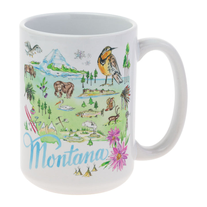Celebrate Big Sky Country with this ceramic Montana State Mug, alive with watercolor-style artwork of mountains, wildlife, wildflowers, and iconic scenes from across the state. A sturdy build and easy-grip handle make it an inviting everyday companion for coffee or tea as you savor a little Montana at your table. Approximate dimensions are 5 x 3.25 x 4.75 inches.
