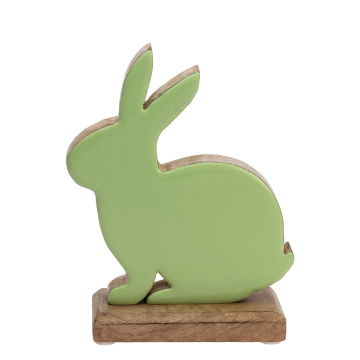 Crafted of mango wood with a smooth green finish and softly exposed grain along the edges, this petite bunny figurine brings playful charm to any shelf or tabletop. A clean silhouette and sturdy base make it an easy accent that layers beautifully with neutrals or adds a fresh pop of color on its own. Approximate dimensions are 5.25 x 2 x 6.75 inches.