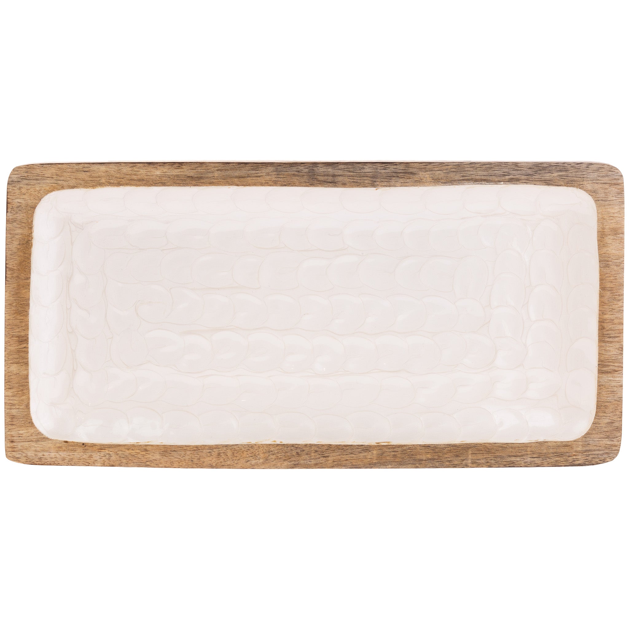 A luminous mother-of-pearl inlay shimmers within a warm mango wood frame, lending this medium rectangular tray effortless coastal elegance. Perfect on the tabletop for presenting small bites or on the entryway console to corral everyday essentials, it brings natural texture and subtle sheen to any setting. Approximate dimensions are 16.25 x 7.5 x 1 inches.