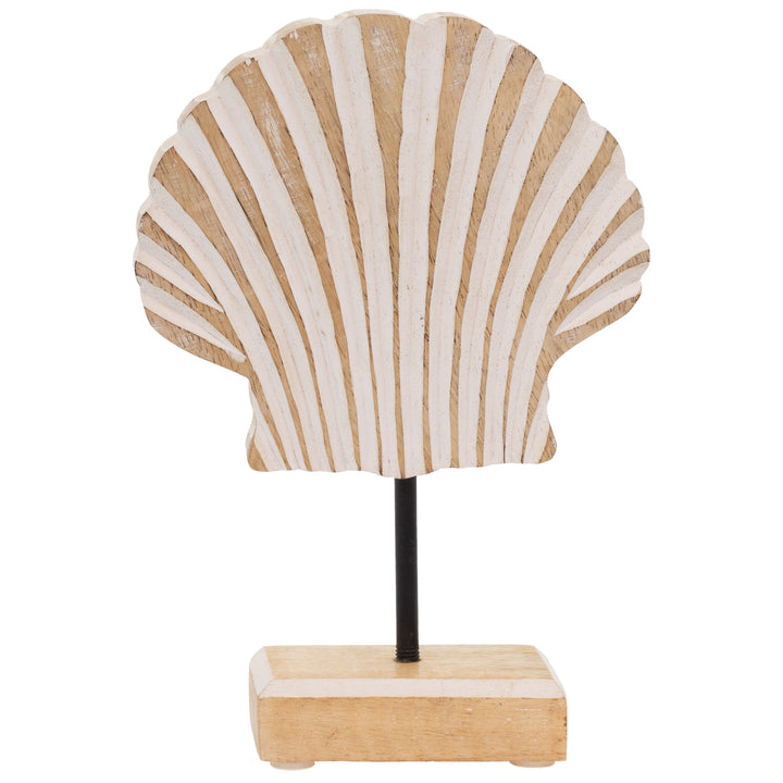 Evoke coastal calm with the Whitewash Scallop Shell Small, a mango wood figurine carved with clean ridges and finished in a soft whitewash. Elevated on a simple stand, its warm natural grain and iconic shell silhouette bring easy charm to shelves, mantels, and curated vignettes. Approximate dimensions are 5.5 x 2 x 8 inches.