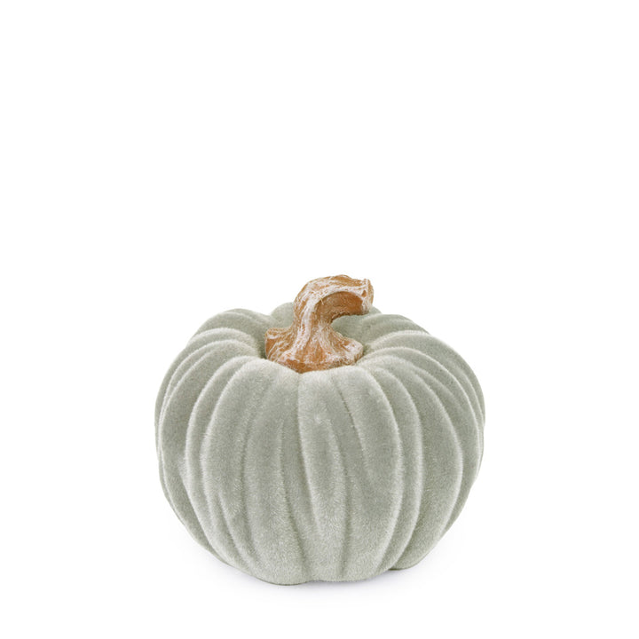 Soft grey velvet dresses this small pumpkin, offering a refined, tactile accent for shelves, trays, and tabletops. A durable polyresin form and sculpted stem give it lasting structure and a chic neutral look that layers effortlessly with other decor. Approximate dimensions are 3 x 3 x 3 inches.