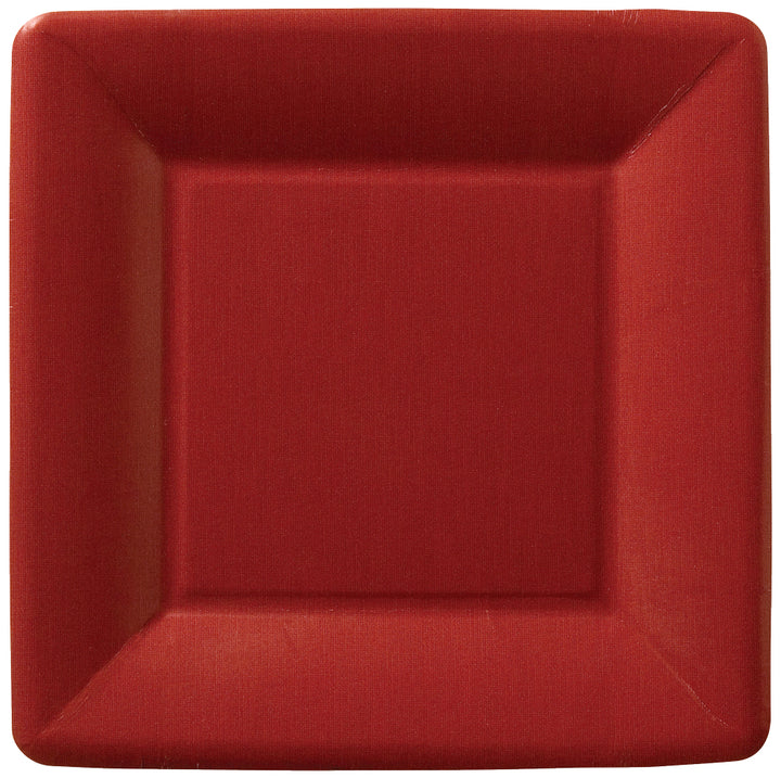 Rich dark red color and a linen-look finish give this square dessert plate a refined, modern presence that elevates cakes, tarts, and small bites. Crafted from sturdy paper for dependable single-use service, it coordinates effortlessly with everyday table settings and makes cleanup simple. Approximate dimensions are 7.25 x .75 x 7.25 inches.