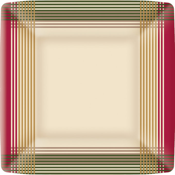 Clean-lined and striking, the Cross Square Dessert Plate pairs a cream center with rich red sides and slender green-and-gold cross stripes for a crisp, tailored pattern. Crafted of quality paper for easy disposal and reliable serving, this square dessert plate makes sweets and small bites feel polished at any gathering.