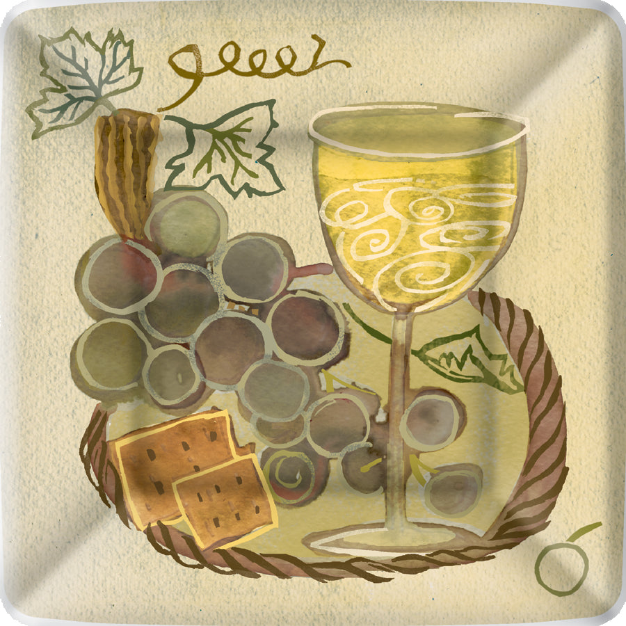 Toast to effortless entertaining with our Napa White Square Dessert Plate, a sturdy paper design featuring vineyard-inspired grapes and a swirling wine glass that sets the scene for tastings and sweet finishes. The modern square silhouette holds petits fours, cheeses, and bite‑size desserts with leak‑resistant strength and quick, toss‑and‑go cleanup. Approximate dimensions are .75 x 7.25 x 7.25 inches.