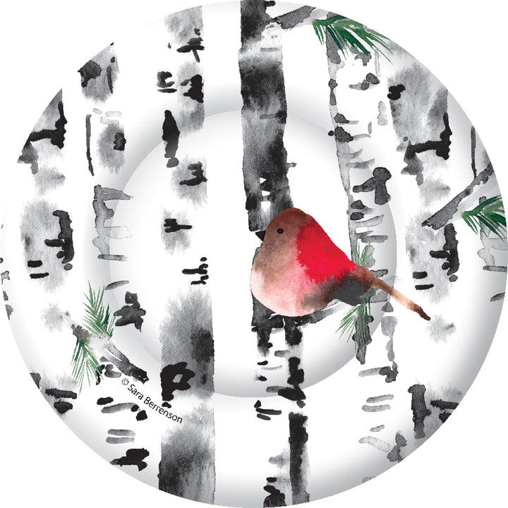 Bring woodland charm to the table with the Bird In Birch Round Dinner Plate, featuring a watercolor red-breasted bird nestled among softly brushed birch trees. Crafted from sturdy paper for effortless cleanup, this round dinner plate makes casual meals and gatherings feel artful and inviting. Approximate dimensions are 10.5 x 1.25 x 10.5 inches.