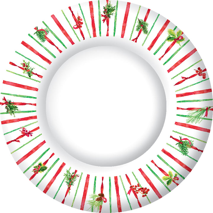 Watercolor ribbon stripes and sprigs of greenery wrap the rim of this round paper dinner plate, bringing a crisp, patterned pop to every place setting. Crafted from sturdy paper for reliable performance, it handles generous servings with style and makes cleanup refreshingly simple. Approximate dimensions are 10.5 x 1.25 x 10.5 inches.