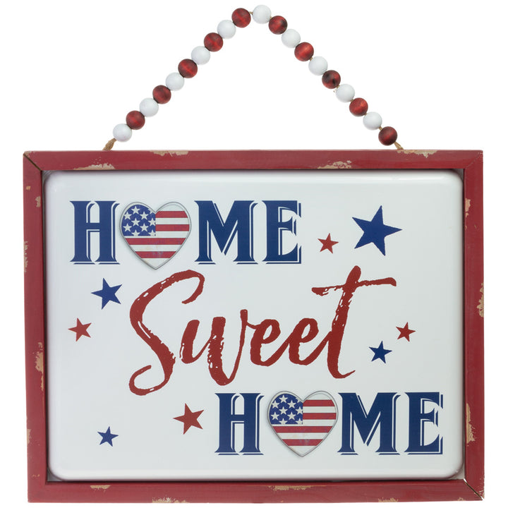 Celebrate home and country with this metal Patriotic Home Sweet Home Sign, featuring bold navy lettering, star accents, and flag-filled heart O’s framed by a softly distressed red border. A beaded hanging cord makes it easy to display, bringing durable charm and heartfelt sentiment to entryways, kitchens, or covered porches. Approximate dimensions are 17.5 x 1 x 13.5 inches.