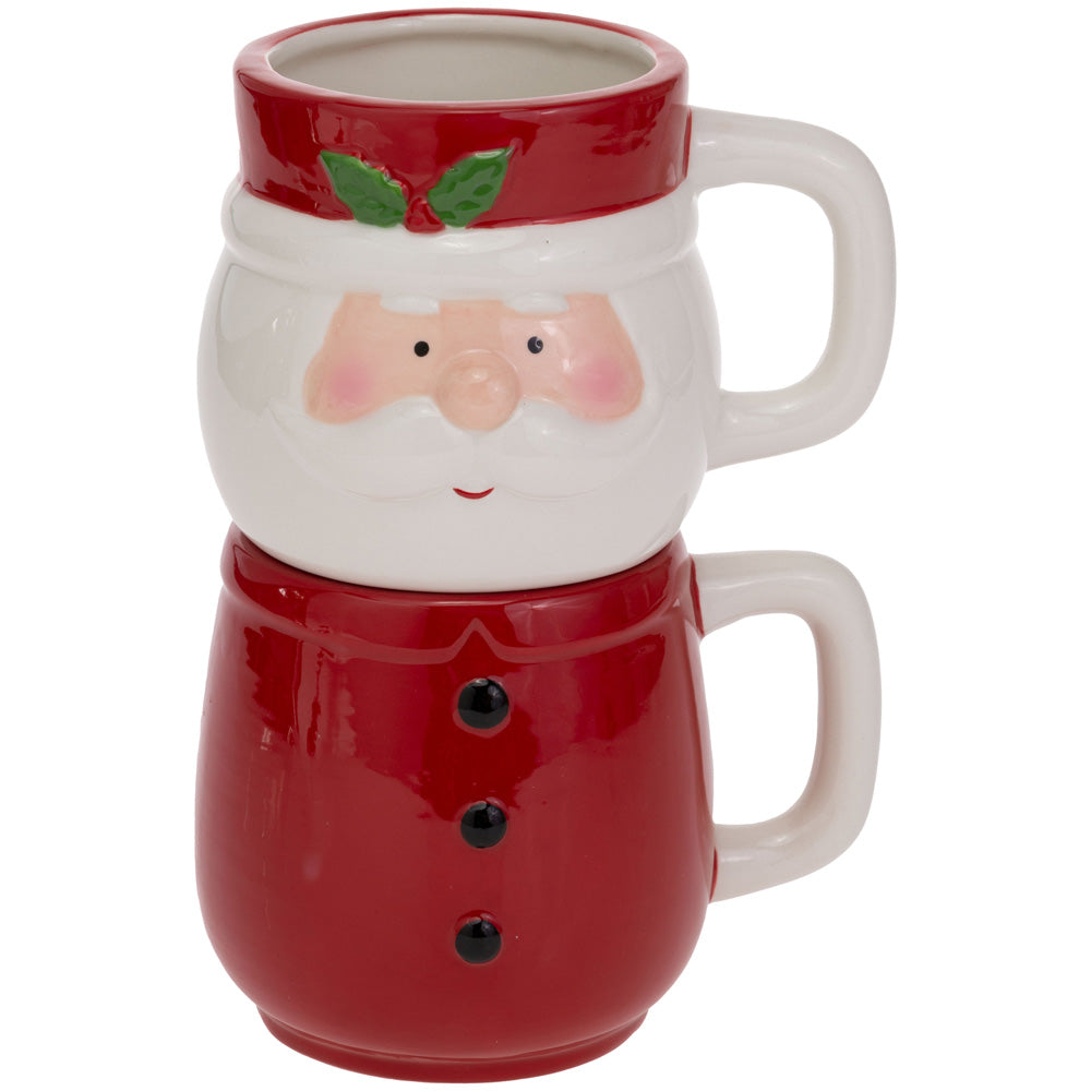 Two sculpted ceramic mugs stack to form a full Santa—from rosy cheeks to a buttoned red coat—bringing playful charm to every pour. Finished in a glossy, durable glaze, each mug has a comfortable handle and nests neatly to save space when stored. Approximate dimensions are 5 x 3.75 x 7.25 inches.