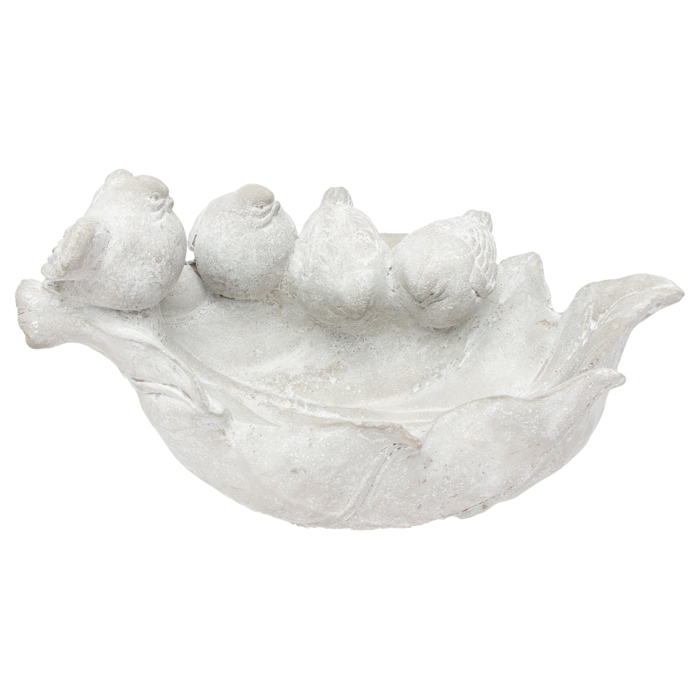 Sculpted in solid cement, this leaf-shaped feeder cradles seed while four charming birds perch along the rim for a sweet, nature-inspired accent. Its weighty, weather-ready design and soft stone finish make it equally striking on a patio, porch, or nestled among garden beds. Approximate dimensions are 9.75 x 5.5 x 4.5 inches.
