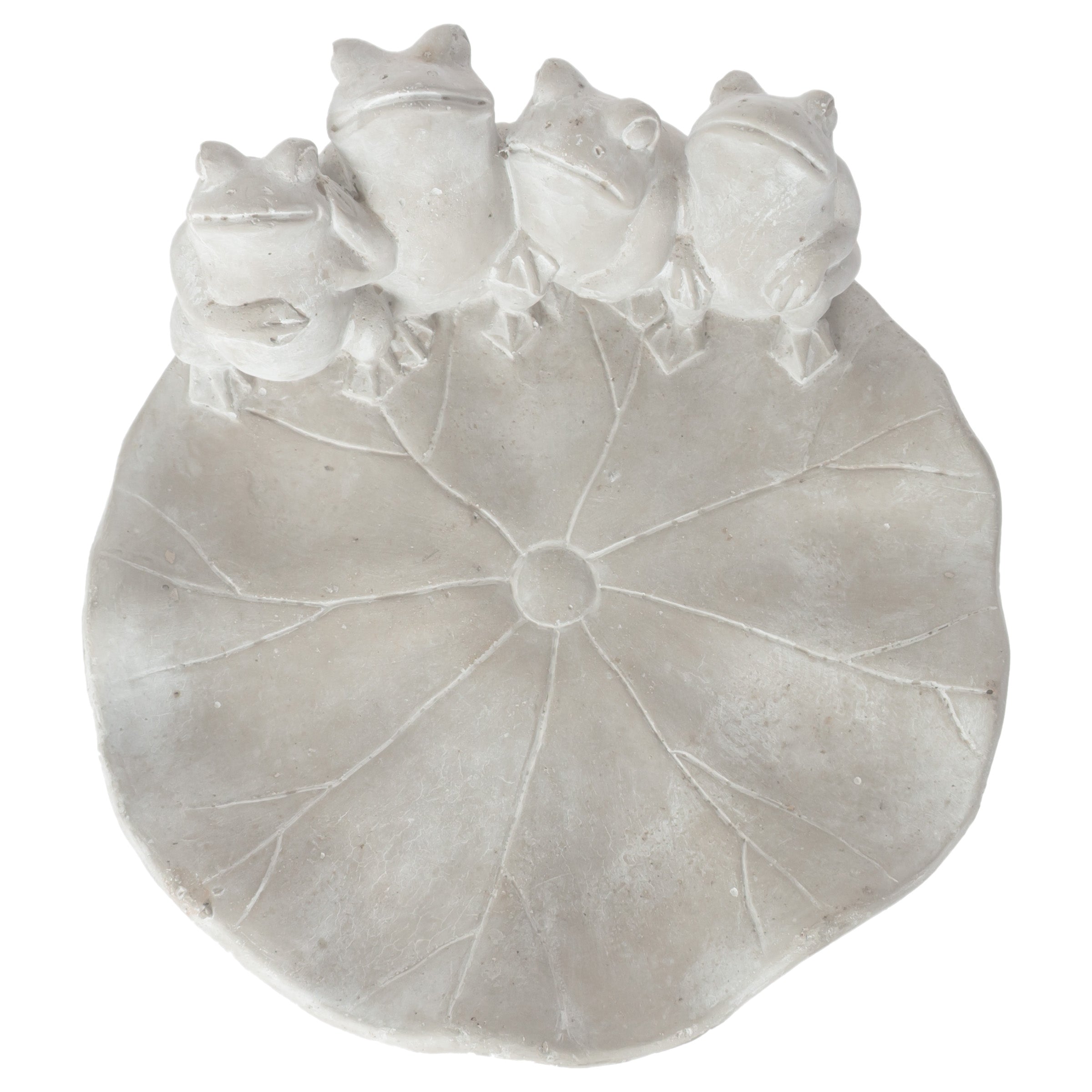 Bring a dash of pondside whimsy to any space with this sculpted cement lily pad, rimmed by a charming quartet of frogs. Cast in durable cement with subtle leaf veining, it makes a playful accent for garden paths, porches, or a tabletop vignette. Approximate dimensions are 10.5 x 10.5 x 5 inches.