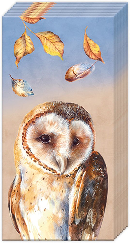 Carry a touch of woodland charm with Evie Pocket Tissue Cream Blue, featuring a tender watercolor-style owl drifting beneath a cream-to-blue sky with floating leaves and feathered detail. These soft, dependable paper tissues tuck neatly into bags and coat pockets for gentle, everyday care on the move. Approximate dimensions are 4 x 2.25 x .75 inches. German printed on soft, 3-ply paper.