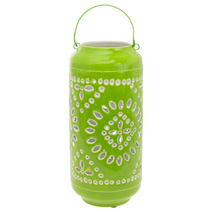 Bold lime color and a lacy perforated pattern make this large iron lantern a standout accent, scattering delicate, dappled light from the glow within across patios and porches. Durable iron construction and a convenient handle allow easy placement on a tabletop or hanging from a hook, instantly elevating outdoor ambiance. Approximate dimensions are 6 x 6 x 13.25 inches.