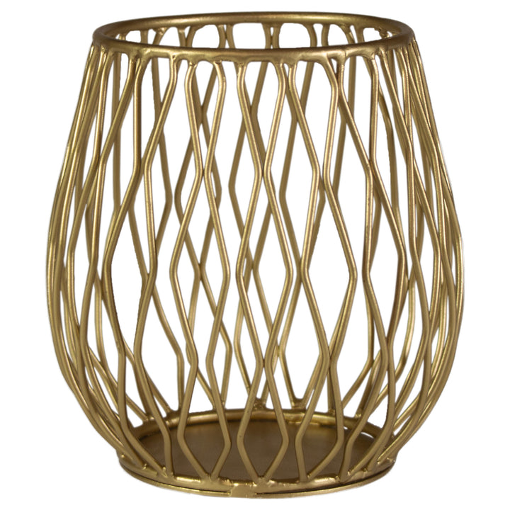 Crafted of iron with a warm gold finish, this large openwork vase showcases a rhythmic geometric lattice that adds light-catching dimension to consoles and centerpieces. Its sculptural silhouette stands beautifully on its own or cradles dried or faux stems for a crisp, modern accent. Approximate dimensions are 8.25 x 8.25 x 9.25 inches.