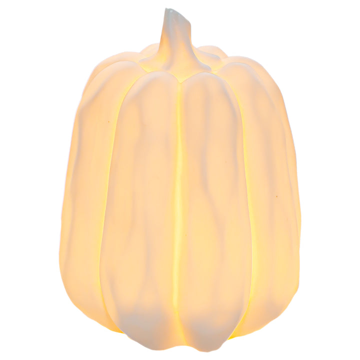 Softly illuminated from within, this white LED pumpkin highlights its sculpted ridges with a serene, modern glow. The medium-size accent styles effortlessly on mantels, consoles, or centerpieces and blends seamlessly with both minimalist and collected décor. Approximate dimensions are 4.25 x 4.25 x 5.25 inches.