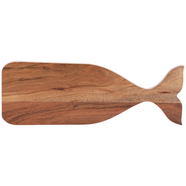 Shaped in a charming whale silhouette, this small acacia wood board brings coastal character to the table with warm, varied grain that makes each piece unique. Slice and serve cheeses or snacks on the smooth surface while the tail fin acts as an easy-grip handle and playful plating accent. Approximate dimensions are 12.75 x 4.25 x .5 inches.