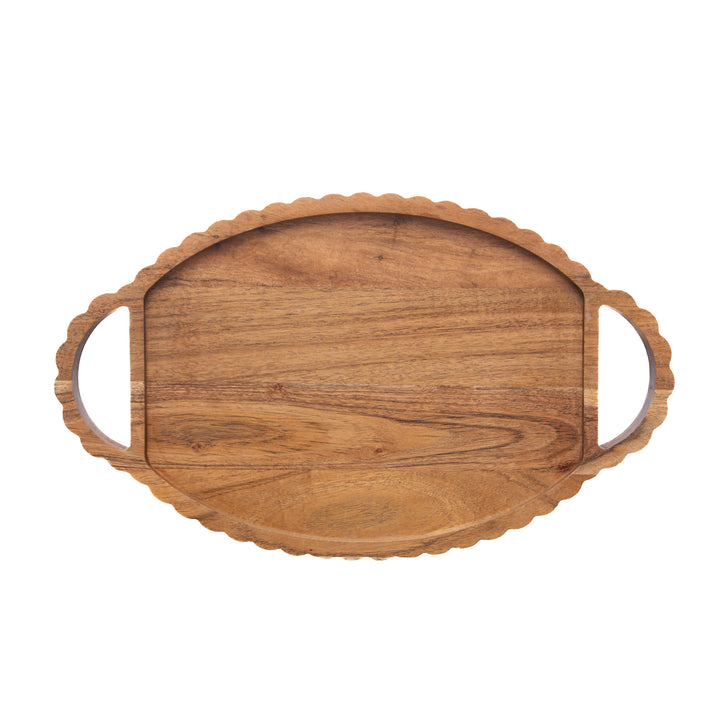 Gracefully scalloped edges trace the oval silhouette, letting the rich acacia wood grain bring natural pattern to the table. Integrated side handles and a gently rimmed surface make this versatile tray ideal for serving drinks and small bites or corralling decor on a counter or console. Approximate dimensions are 17 x 10 x .75 inches.