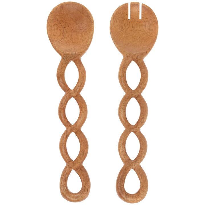 Sculptural braided handles bring pattern and dimension to this mango wood serving set, highlighting the material’s warm, natural grain. The generously sized spoon and fork create a striking pair for tossing and serving salads, pastas, and shared dishes at any table. Approximate dimensions are 12 x 2.75 x .75 inches.