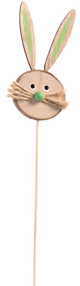 Crafted of plywood with green-accented ears, a button nose, and twine whiskers, this bunny-face pick brings a playful pop of personality to arrangements, baskets, and potted plants. Tuck the slender stake into florals or tabletop displays for an instant nod to Easter with natural texture and charm. Approximate dimensions are 2 x 2 x 14 inches.