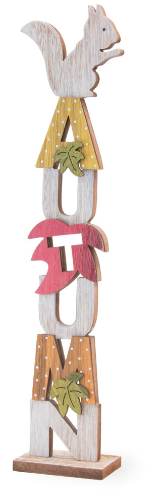 A whimsical squirrel crowns stacked letter art spelling AUTUMN, bringing woodland charm and playful wordplay to shelves, mantels, or entry tables. Crafted of metal with crisp inked details and dimensional leaf accents, this slim freestanding figurine adds textured personality to your display. Approximate dimensions are 3.25 x 2 x 15 inches.