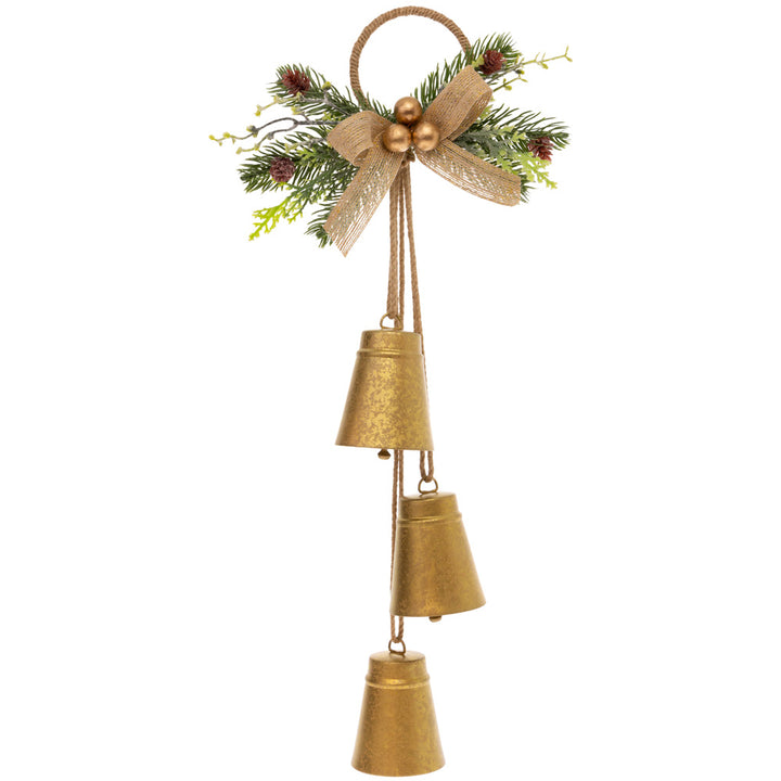 Welcome guests with the Gold Liberty Bell Door Hanger, where three gold-tone bells sway beneath a vine loop trimmed with lifelike polyester and PE greenery. Finished with a textured bow, this lightweight accent brings a graceful note to entryways, covered porches, and interior doors year-round.
